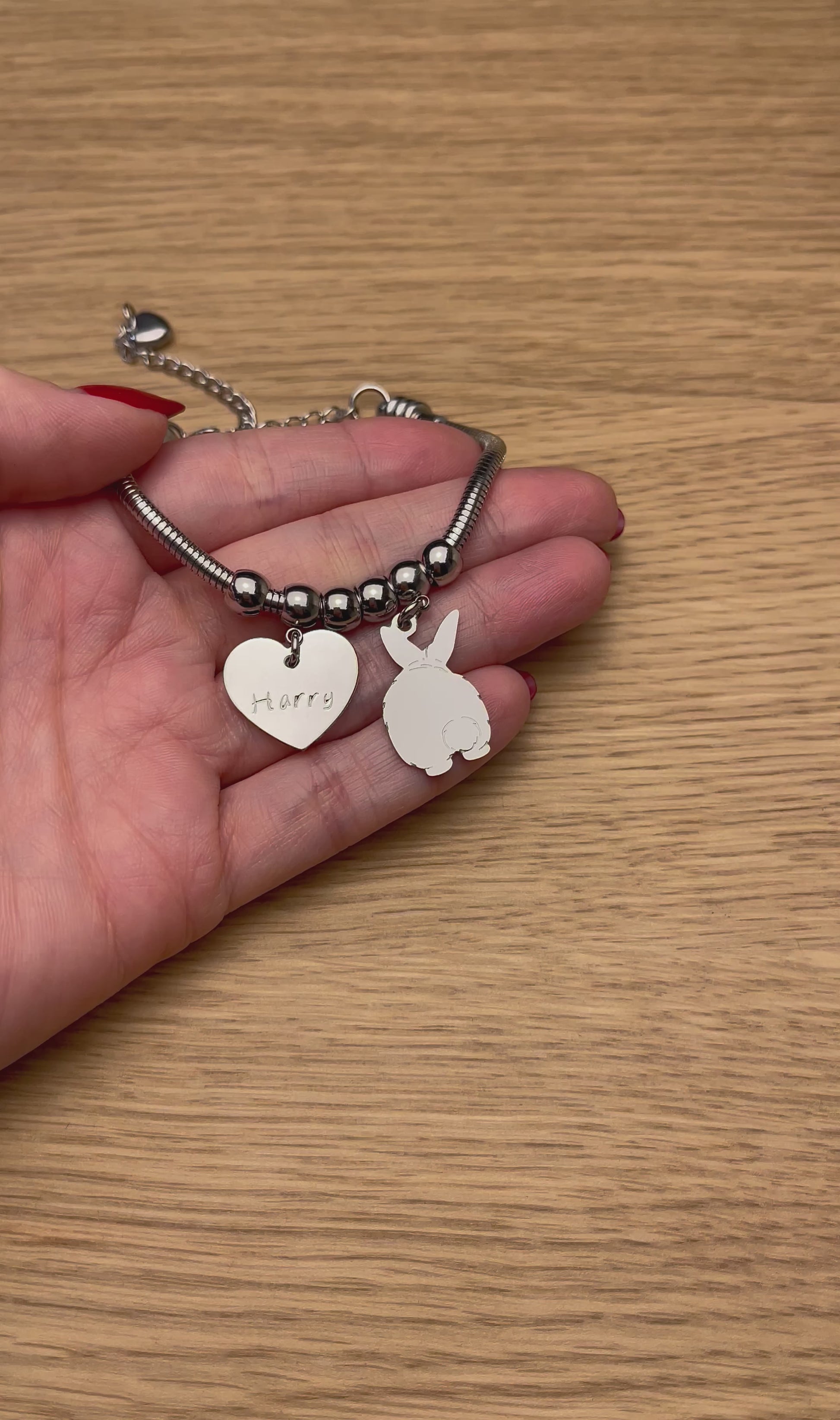 Bellissimo bracciale con ciondolo coniglio codino a pon pon e cuore personalizzata con iniziale incisa.
