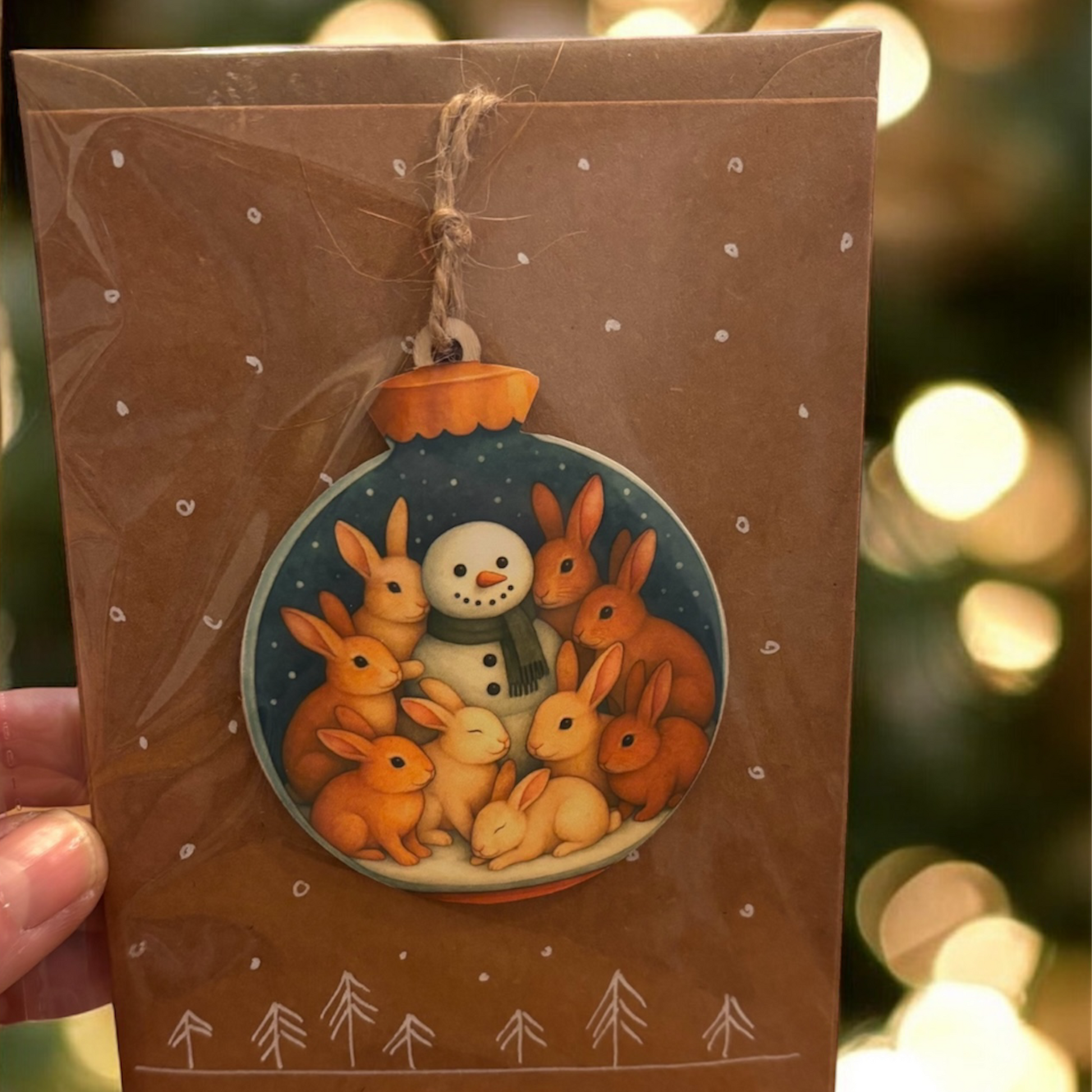 Bellissima Decorazione Natalizia con illustrazione palla Natalizia con coniglietti e pupazzo di neve
